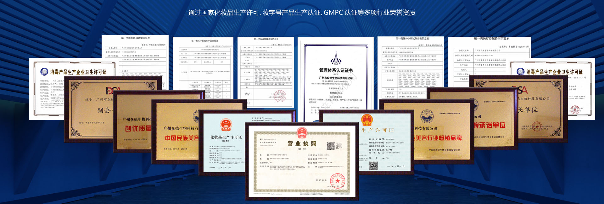 通這國家化妝品生產許可,妝字號,消字號,械字號,粉單元產品生產許可證產品生產認證,GMPC認證等多項行業榮譽資質